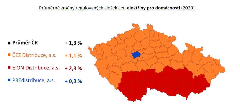 Energetický regulační úřad rozhodl, že v roce 2020 vzroste regulovaná cena elektřiny pro domácnosti v průměru o 1,3 procenta. Přesněji řečeno, bude záležet na tom, jakého máte distributora. Asi nejlépe vypadá situace pro pražské zákazníky PRE, kde se u některých distribučních sazeb dokonce očekává i mírný pokles cen. Podle následující mapky zjistíte, o kolik průměrně poroste regulovaná cena ve vašem okolí.