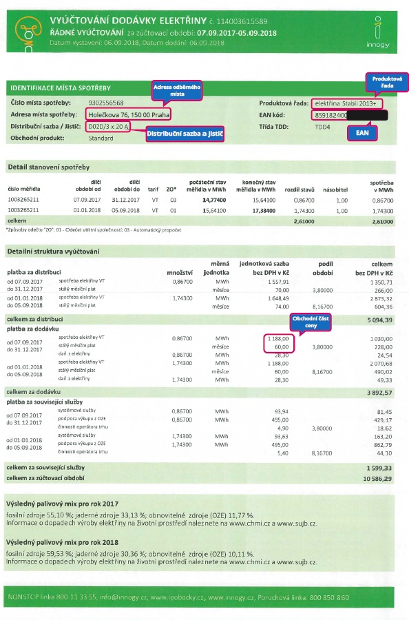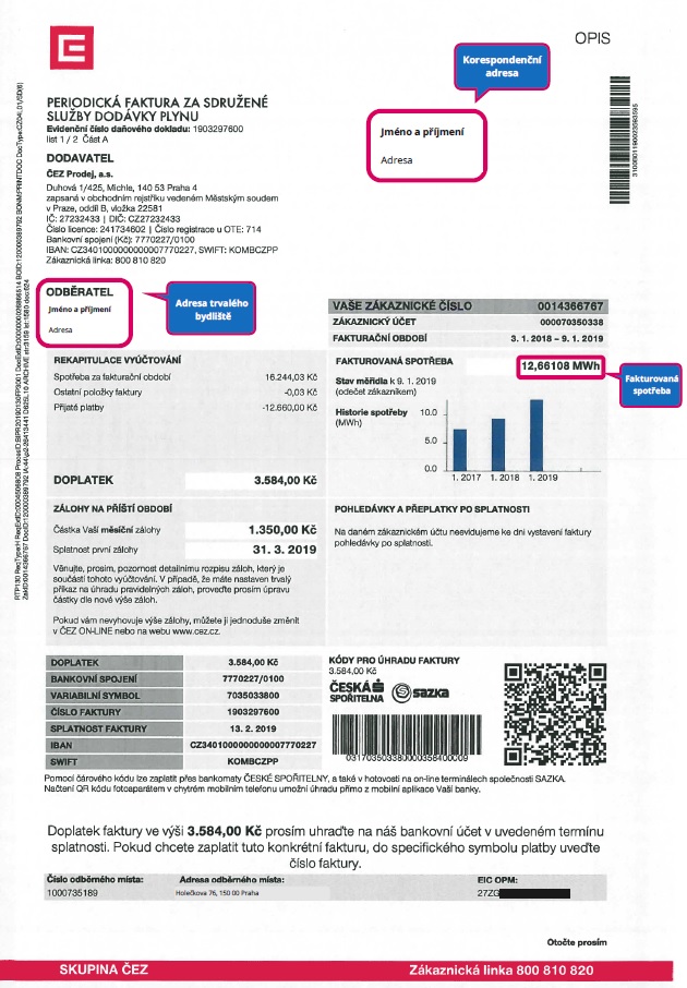 Jako vzorový příklad nám posloužila faktura společnosti ČEZ. Máte-li vyúčtování od jiného dodavatele, můžete se touto ukázkou řídit rovněž, protože základní položky musí být vždy stejné.