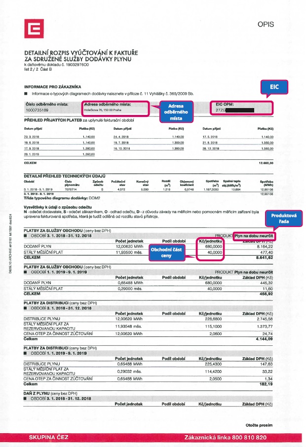 Podobně jako u faktury za elektřinu, i u té za dodávky plynu najdete na druhé straně číslo a adresu odběrného místa spolu s jeho kódem. Ten je u plynu označen EIC, případně EIC OPM.
