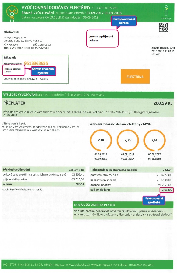 Jako ukázku jsme použili fakturu společnosti Innogy. Jestli držíte v ruce vyúčtování od jiného dodavatele, nic se neděje. Ačkoli od každé společnosti vypadá vyúčtování trochu jinak, musí vždy obsahovat neměnné a povinné údaje: